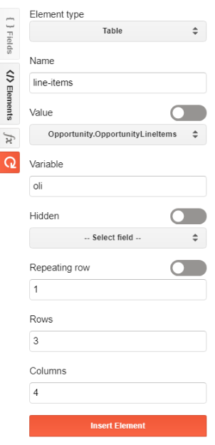 Select the "Table" Element. The Table iterates through records selected in the "Value" parameter, and for every record, in the iteration, the table row is repeated. The "Variable" parameter represents the current record in the iteration.